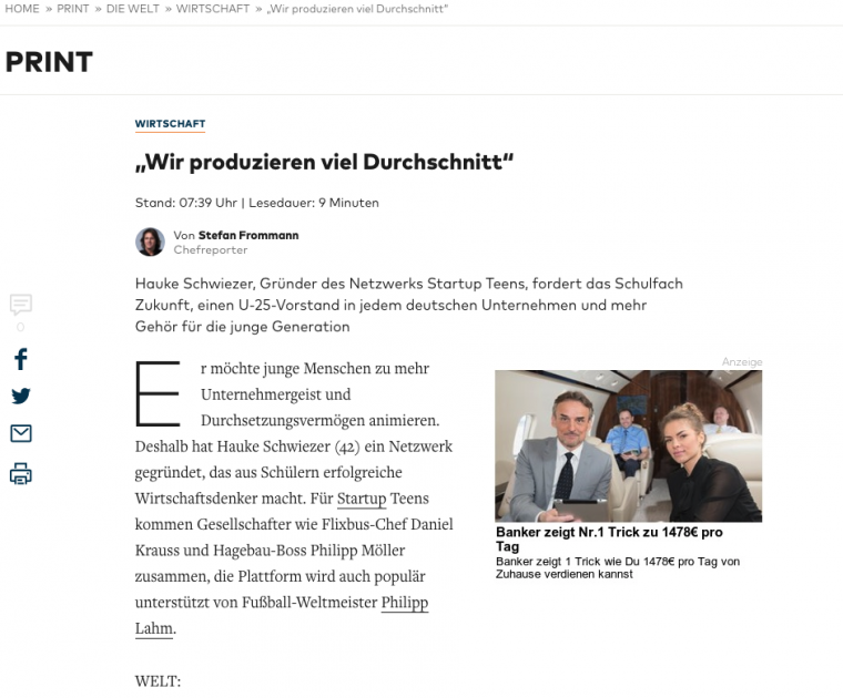 Er möchte junge Menschen zu mehr Unternehmergeist und Durchsetzungsvermögen animieren. Deshalb hat Hauke Schwiezer (42) ein Netzwerk gegründet, das aus Schülern erfolgreiche Wirtschaftsdenker macht. Für Startup Teens kommen Gesellschafter wie Flixbus-Chef Daniel Krauss und Hagebau-Boss Philipp Möller zusammen, die Plattform wird auch populär unterstützt von Fußball-Weltmeister Philipp Lahm.