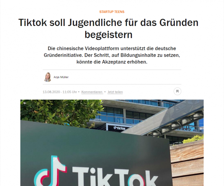 Die Videoplattform Tiktok steigt als Hauptsponsor bei Startup Teens ein. Die deutsche Nonprofit-Initiative will Schüler zwischen 14 und 19 Jahren ermuntern, eigene Unternehmen zu gründen, und hat bislang diese über die eigene Webseite und Veranstaltungen sowie Videos via Youtube auch zum Programmieren erreicht. Nun folgt Startup Teens der Zielgruppe auf Tiktok.