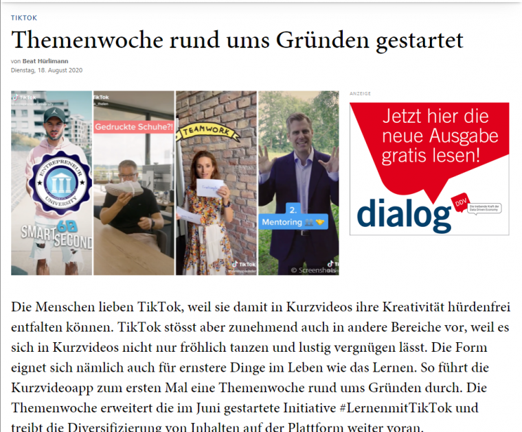 Für die Themenwoche haben sich viele bekannte deutsche Gründer*innen ein eigenes Profil auf TikTok angelegt. Abwechslungsreiche Inhalte bieten unter anderem Frank Thelen, Verena Pausder, Céline Willers, die Entrepreneur University und die Macher von STARTUP TEENS. Damit inspiriert TikTok seine Nutzer*innen und stellt ihnen Inhalte zu den Themen Gründertum und Start-Ups zur Verfügung.